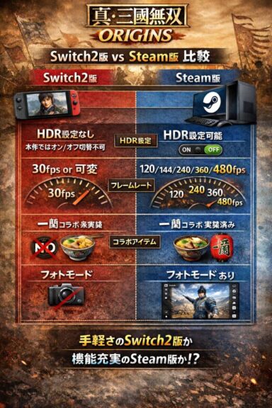 今回、『真・三國無双 ORIGINS』のSteam版とSwitch2版、さらにSwitch2版の「可変」と「30fps」を比較してみました。