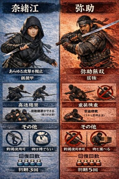 隠密や移動全般は奈緒江、正面からの戦闘は弥助、といった感じですね。