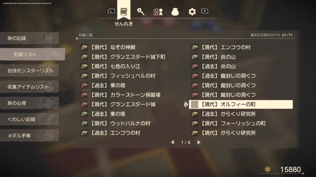 さらに、ストーリー進行に必須となる石板のかけらについても、リストから入手可能な場所を確認できるようになっております。最初からすべてが公開されているわけではありませんが、物語の進行に合わせて徐々に表示される仕組みです。