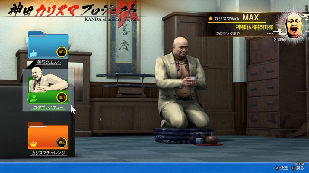 | プレイ状況 | ストーリークリア 難易度:Standard 神田カリスマプロジェクト:ランクMAX 地下ファイトクラブクリア |